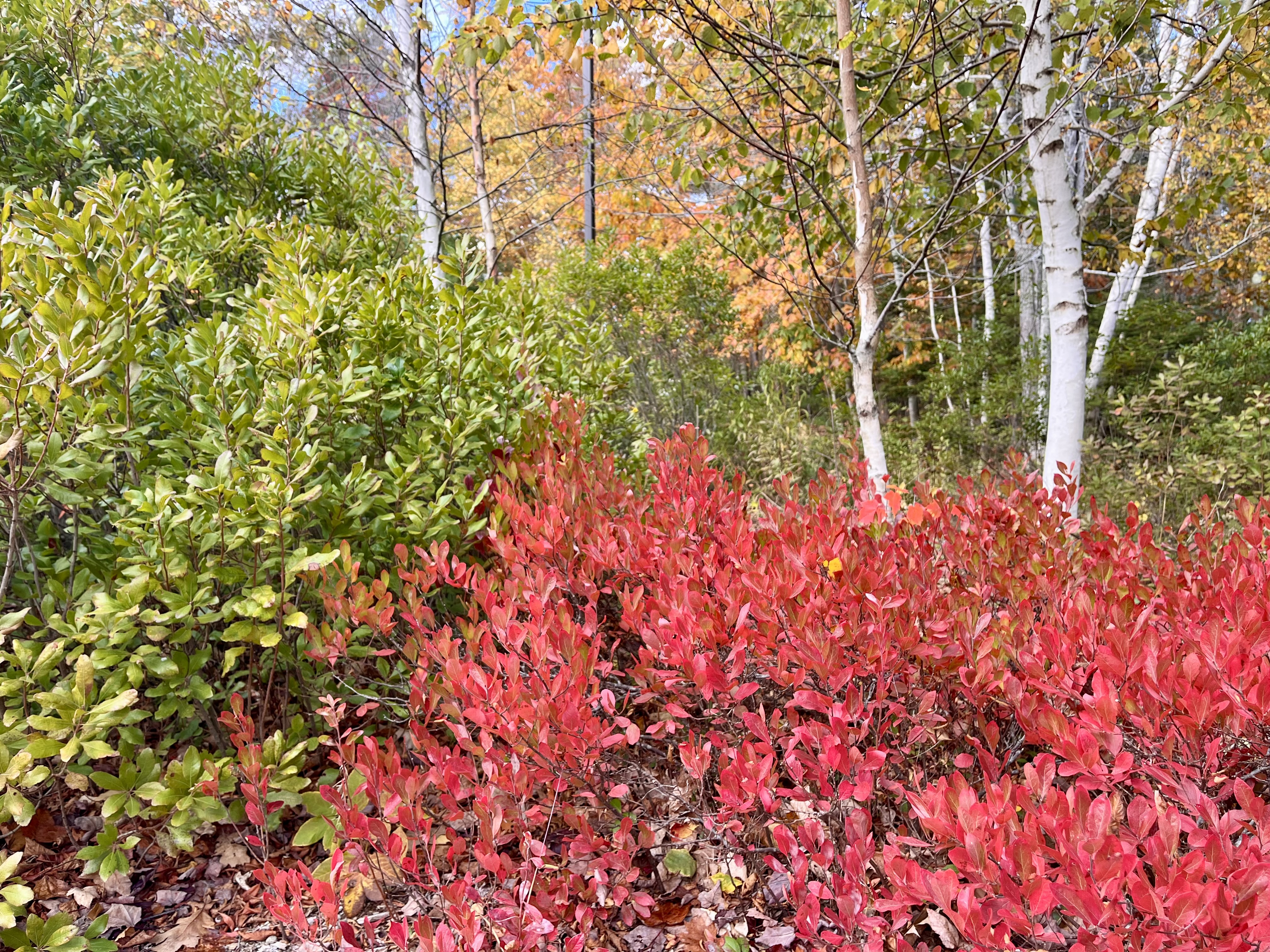 Young stems are yellowish green to reddish brown, may or may not be covered with hair, while older stems are light gray to nearly black. The wood of the stems is relatively brittle and weak. The bark of the adult plant is thin and smooth. The blades of the simple alternate leaves are 1" to 2¼" long and ½" to 1" across; they are oval and smooth along their margins. The upper surface of the blades is yellowish green and slightly shiny, while the lower surface is dull yellowish green and more or less covered with fine yellow resinous dots that are more visible with a 10x hand lens. Short fine hairs are often present on the lower blade surface and petioles. The leaves turn shades of orange and crimson in the fall before falling to the ground.